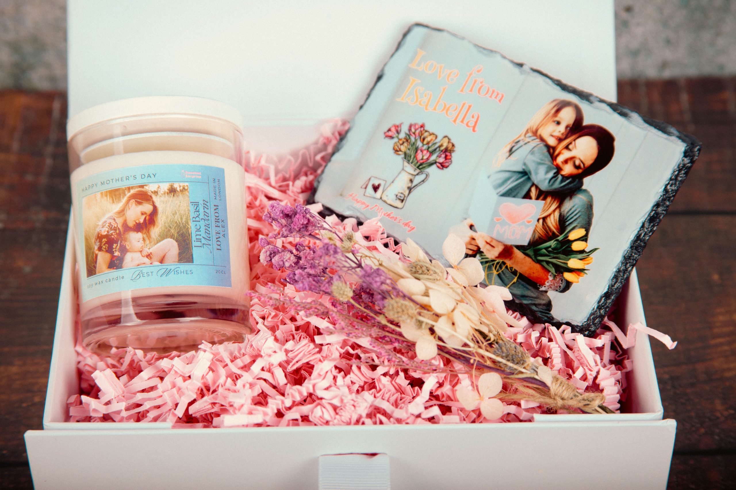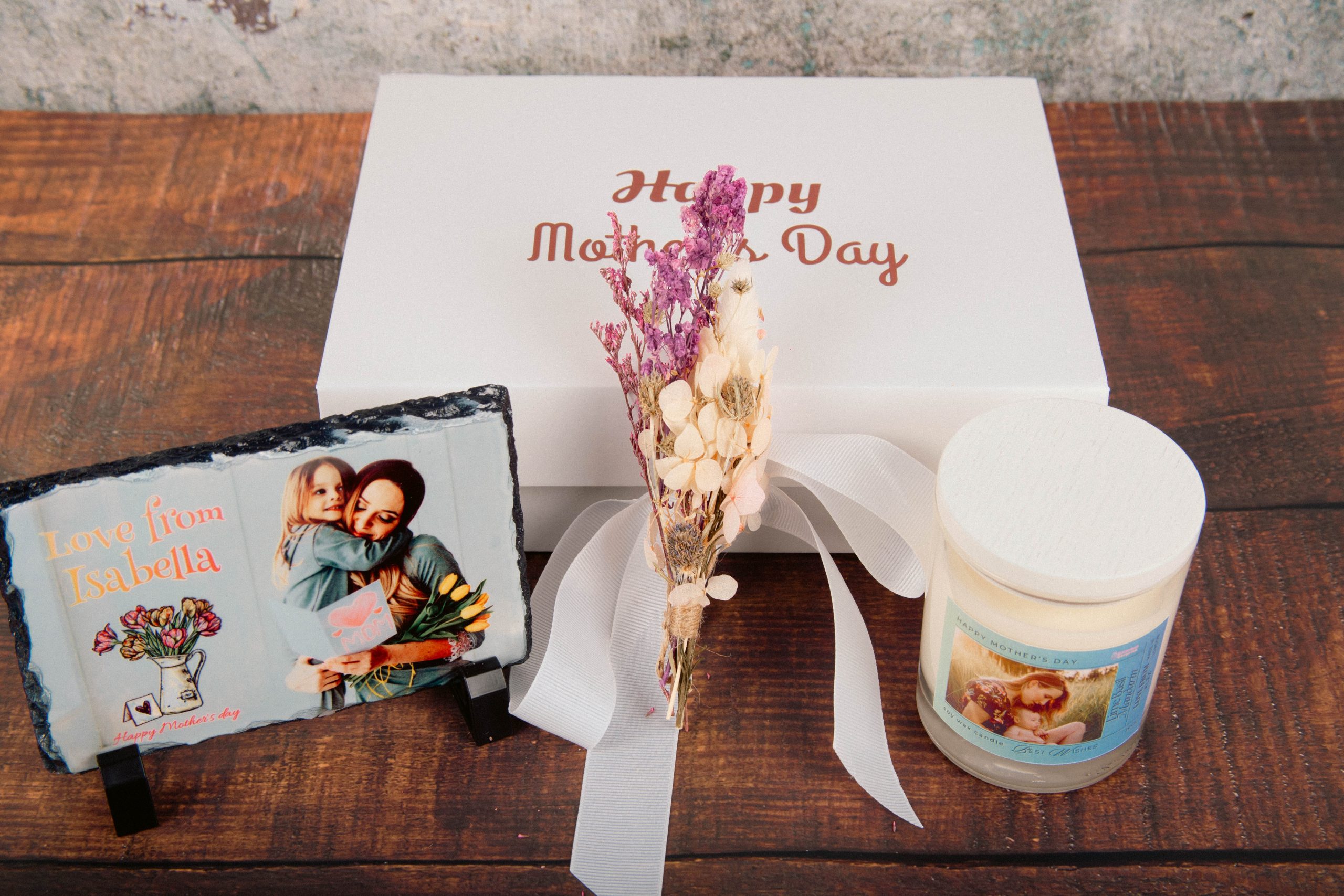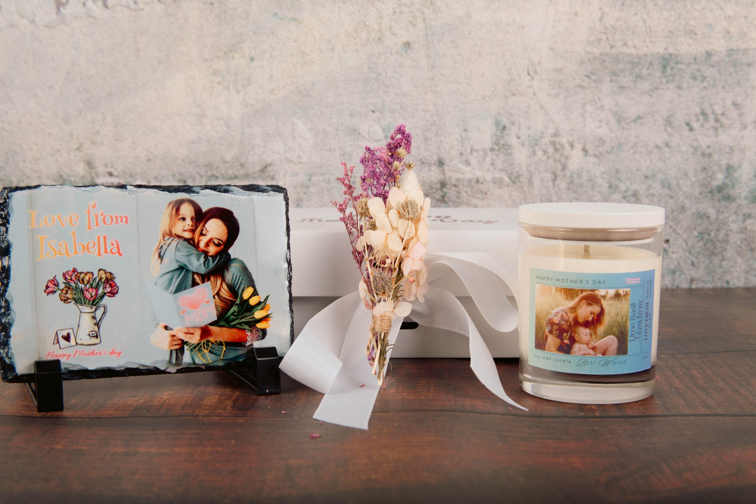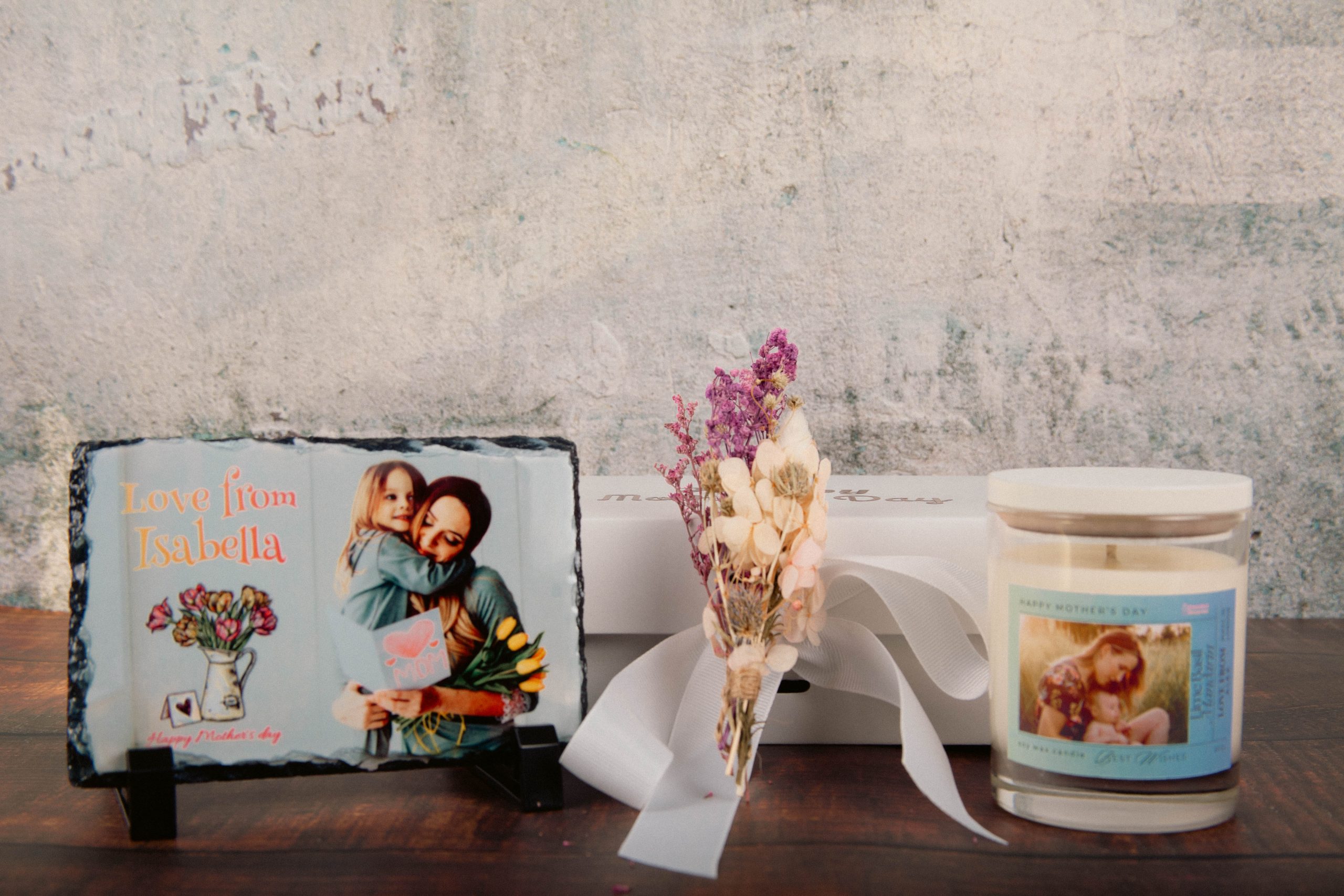 Surprise and delight the special loved one in your life with this exquisite Bloom & Bliss Gift Box. Featuring a personalised photo slate, a soy wax candle with personalised label, and a beautiful dried flower bouquet, this thoughtful collection is the perfect way to show them how much you care.